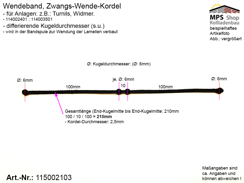 Startseite » Raffstore, Jalousien » TEX®.- Aufzugs.- Wende.- Spannbänder, Leiterkordeln » 115002103, Wendeband, Zwangs-Wende-Kordel, Kugelkette - 210mm, 4 Kugeln